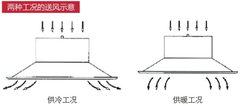 當(dāng)供冷工況送風(fēng)溫度≤17℃時(shí),內(nèi)部導(dǎo)流葉片沿垂直方向自動下移8~10mm,冷風(fēng)沿天花板貼附吹出,當(dāng)供暖工況送風(fēng)溫度≥27℃時(shí),內(nèi)部導(dǎo)流葉片沿垂直方向自動上移8~10mm,暖氣流向下,呈擴(kuò)散狀吹出以便快速有效地混合空氣。
